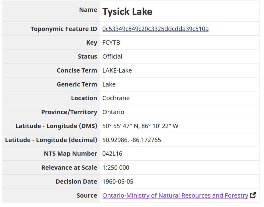 I Found a Lake near Cochrane called Tysick Lake. ![]() ![]() How did it get its name? So I asked the Geographic Names Board It is a memorial to Norman Tysick killed in the last war! ![]() |